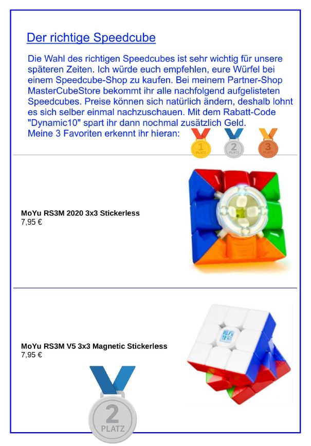 Dieses Modul enthält 3 Videos, 3 PDF-Dateien und Zugang zu einer Speedcubing Community. Ich zeige dir ausführlich, wie du den Zauberwürfel in unter 60 Sekunden lösen kannst. Das Gute daran: du musst keine neue Methode oder ähnliches lernen. Durch den richtigen Speedcube, Fingertricks und ein paar Optimierungen bei der Anfänger-Methode, können wir schon sehr gute Zeiten erzielen. Ich habe so schon Zeiten von unter 30 Sekunden erzielt. Also selbst mit einem originalen Rubiks Cube oder einem No-Name Cube, kannst du die 1 Minute Grenze locker unterschreiten.